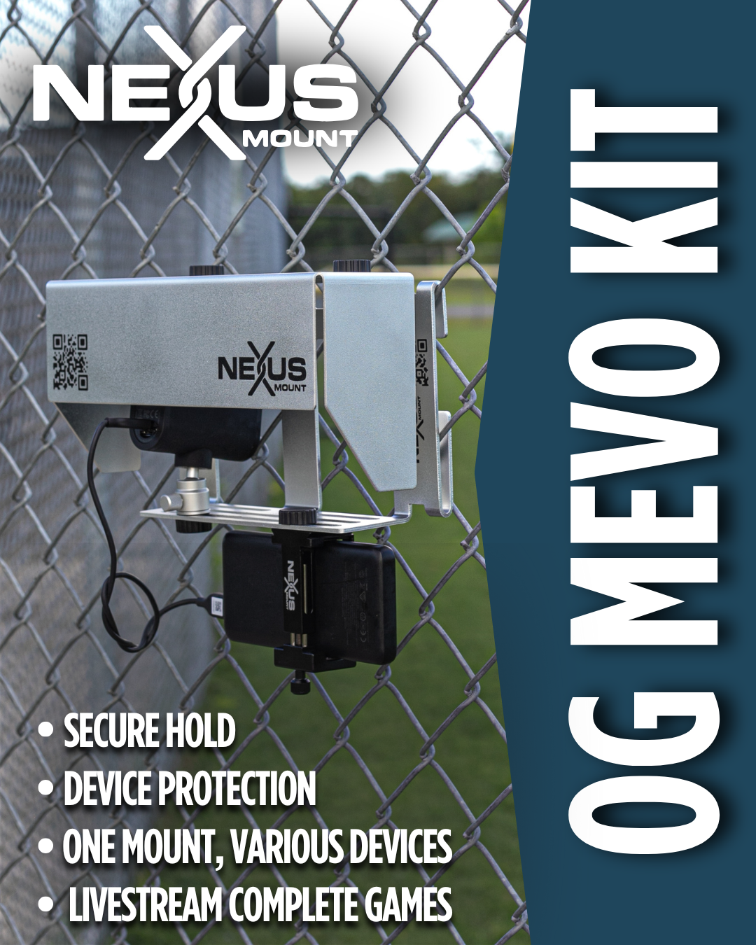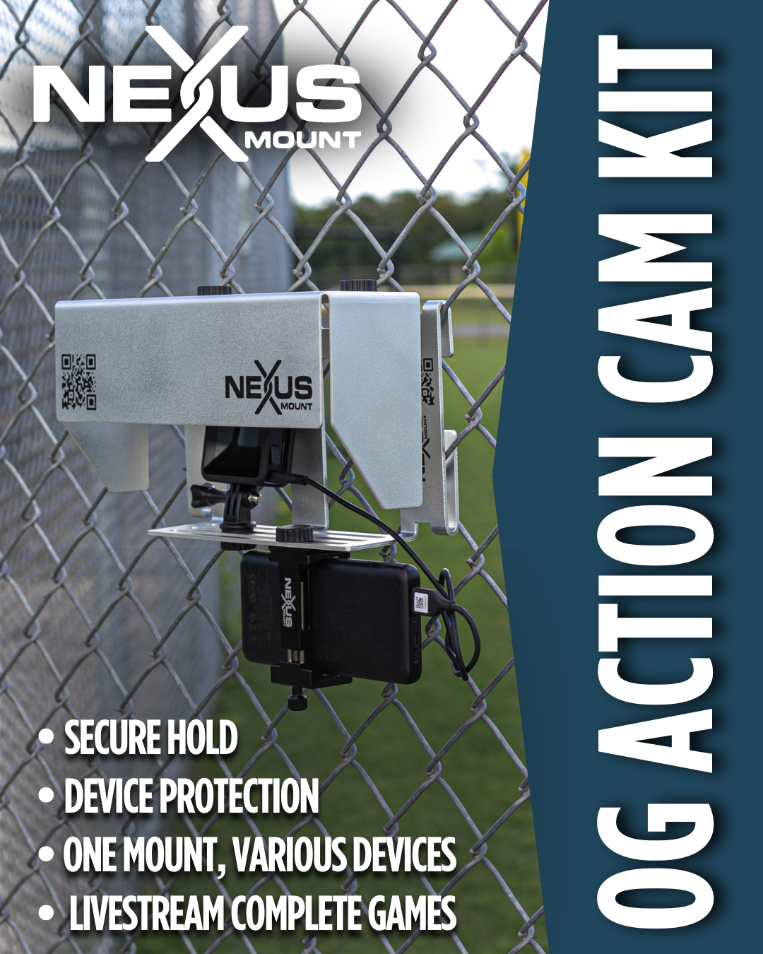 The OG Mount securely holds and shades a smartphone, action camera (GoPro, DJI, etc.), or Mevo Start along with a battery pack to deliver uninterrupted power and stable footage throughout the entire game.